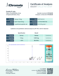 Semax 10mg | DLR-7-Sem10mg | 07/25/25 | 98.476% | 9.851mg | Chromate |