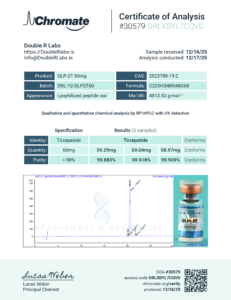 GLP-2T 60mg | DRL-12-GLP2T60 | 12/17/2025 | 99.883% 99.918% 99.909 | 59.29mg 59.04mg 58.97mg | Chromate |