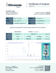 BPC-157 10mg | DRL-12-BC10 | 12/23/2025 | 98.075% 98.134% | 11.02mg 11.08mg | Chromate |